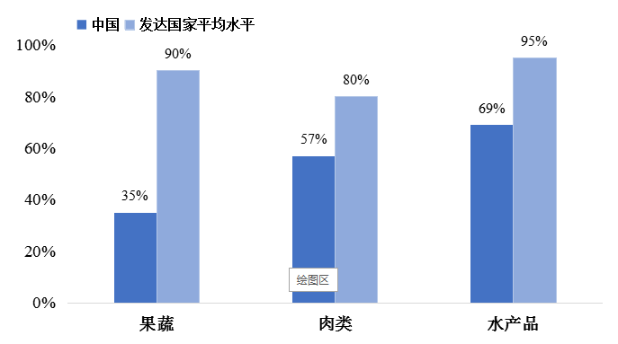 二是冷藏运输率低。目前,我国初级农产品冷链运输率相对发达国家而言一直偏低,发达国家已经达到80%-90%之间的水平,而我国果蔬、肉类、水产品冷藏运输率分别仅有15%、57%、69%(图1)。